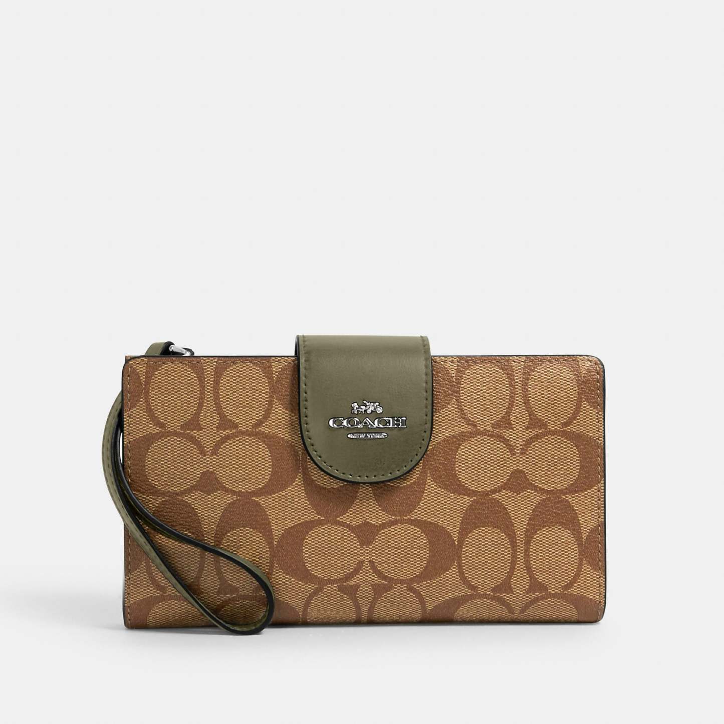 Signature coated canvas and smooth leather Six credit card slots ID window Snap phone compartment Snap closure Outside zip pocket Attached wrist strap 7 1/4 (L) x 4 1/2 (H) Fits all iPhone and Samsung Galaxy phones Style No. C2874
