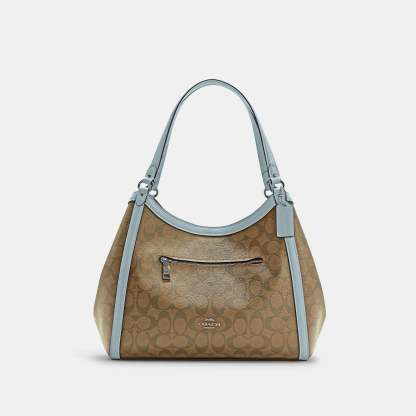 Signature coated canvas and smooth leather Inside zip cell phone and multifunction pockets Center zip compartment Snap closure fabric lining Handles with 9 1/2 drop Outside zip pocket 12 1/2 (L) x 10 3/4 (H) x 5 3/4 (W) Style No. C6232