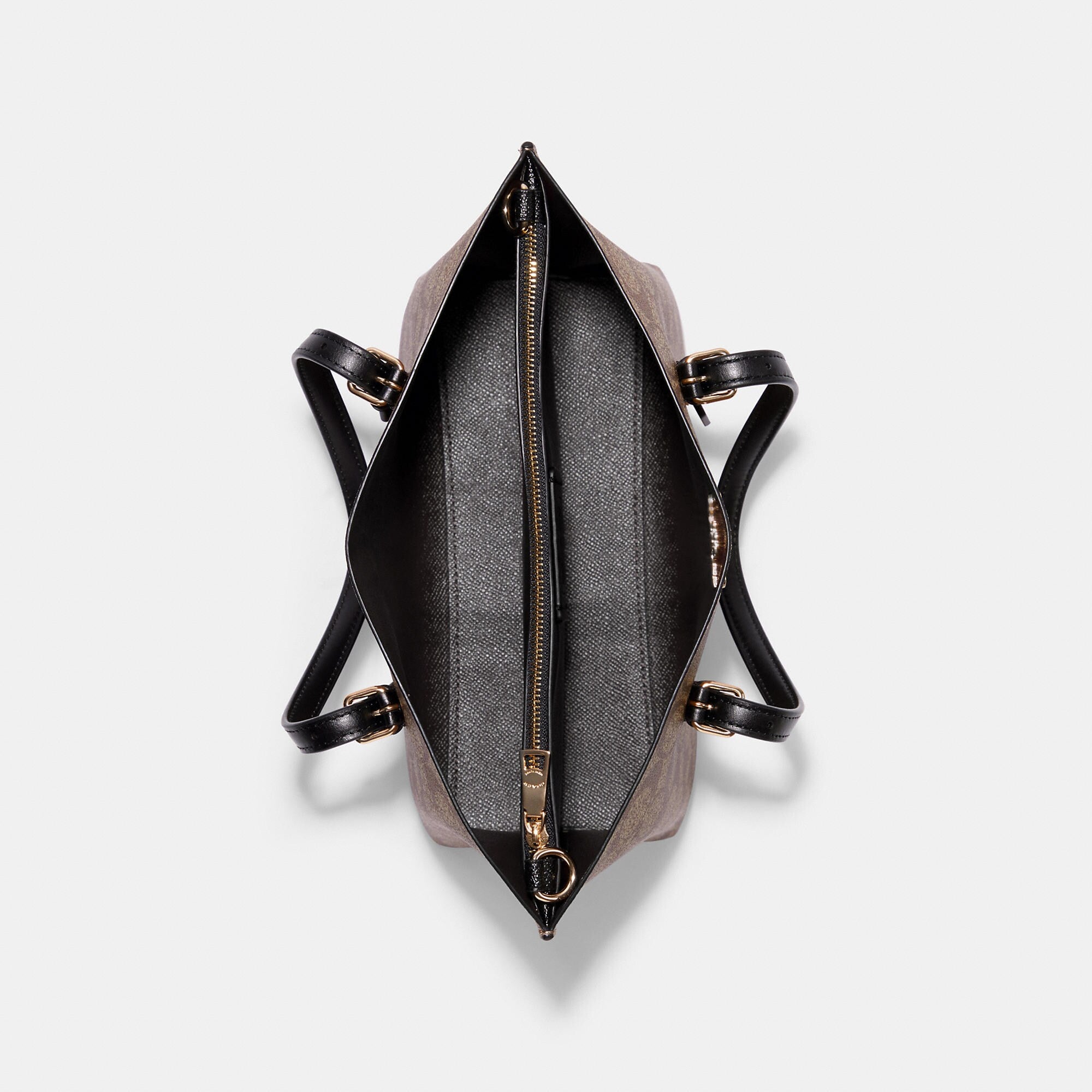 Signature coated canvas and smooth leather Zip-top closure fabric lining Side open compartments Handles with 4 3/4 drop Detachable strap with 22 drop for shoulder or crossbody wear 9 3/4 (L) x 7 1/2 (H) x 4 3/4 (W) Style No. C4250