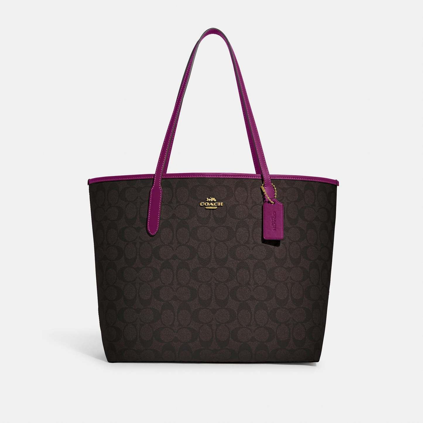 Signature coated canvas with smooth leather details Inside zip pocket Snap closure Handles with 10 drop 13 (L) x 11 1/2 (H) x 6 1/4 (W) Style No. 5696 | Outlet City Tote In Signature Canvas - Purple