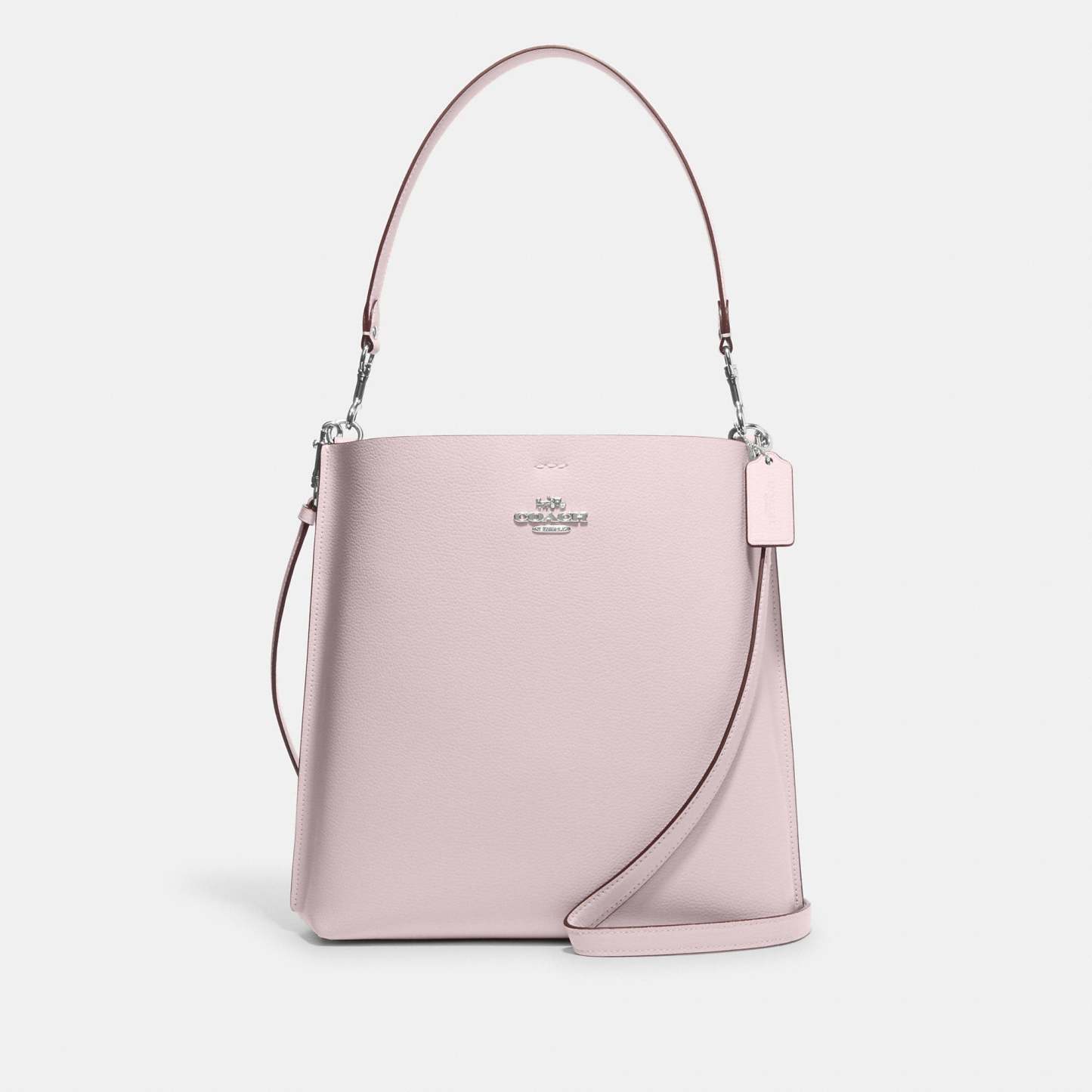 Double face leather Center zip compartment Snap closure Detachable handle with 10 drop Detachable strap with 20 1/2 drop for shoulder or crossbody wear 11 (L) x 11 1/2 (H) x 3 3/4 (W) Style No. CA214 | Outlet Mollie Bucket Bag - White