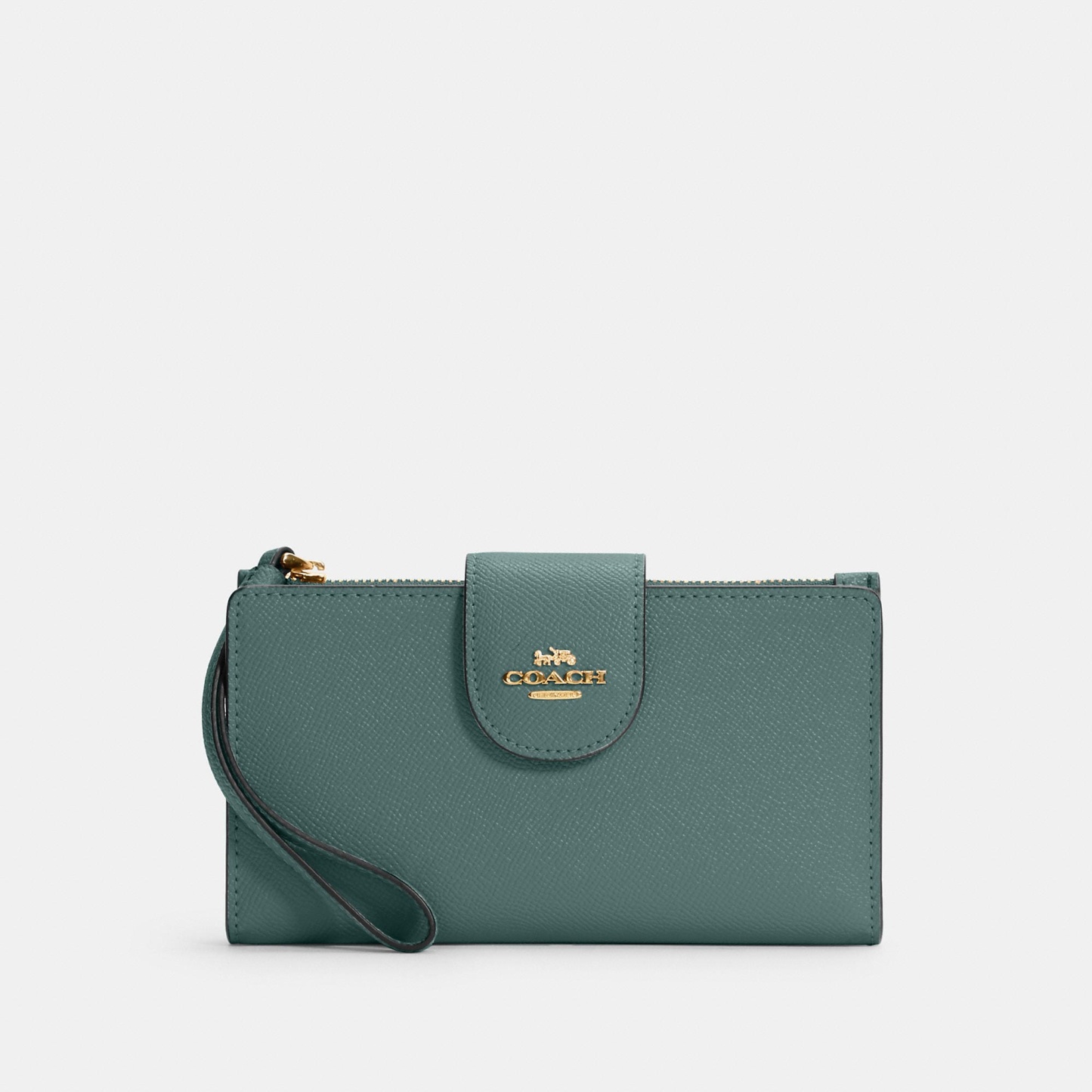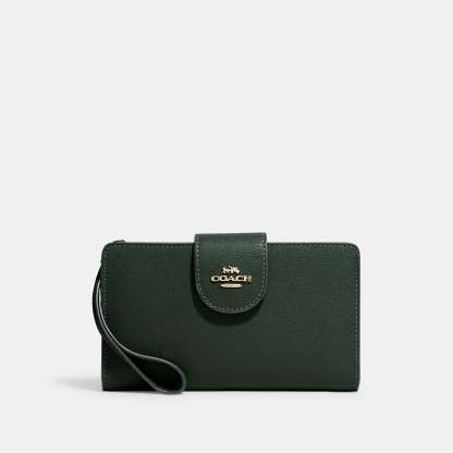 Crossgrain leather Six credit card slots ID window Snap phone compartment Snap closure Outside zip pocket Attached wrist strap 7 1/4 (L) x 4 1/2 (H) Fits all iPhone and Samsung Galaxy phones Style No. C2869 | Outlet Tech Wallet - Brown