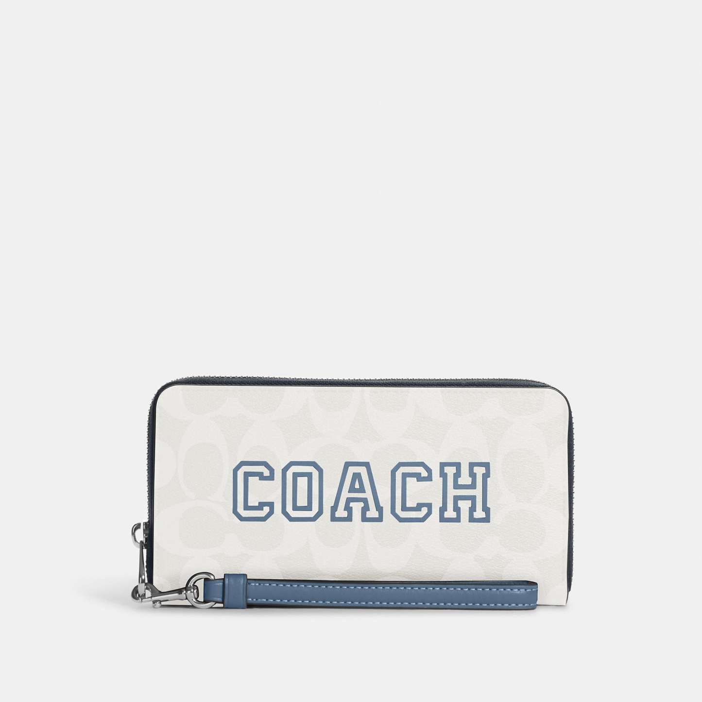 Signature coated canvas and smooth leather Twelve credit card slots Full-length bill compartments Inside zip coin pocket Zip-around closure Detachable wrist strap 7 1/2 (L) x 4 (H) x 1 (W) Fits all iPhone and Samsung Galaxy phones Style No. CB856
